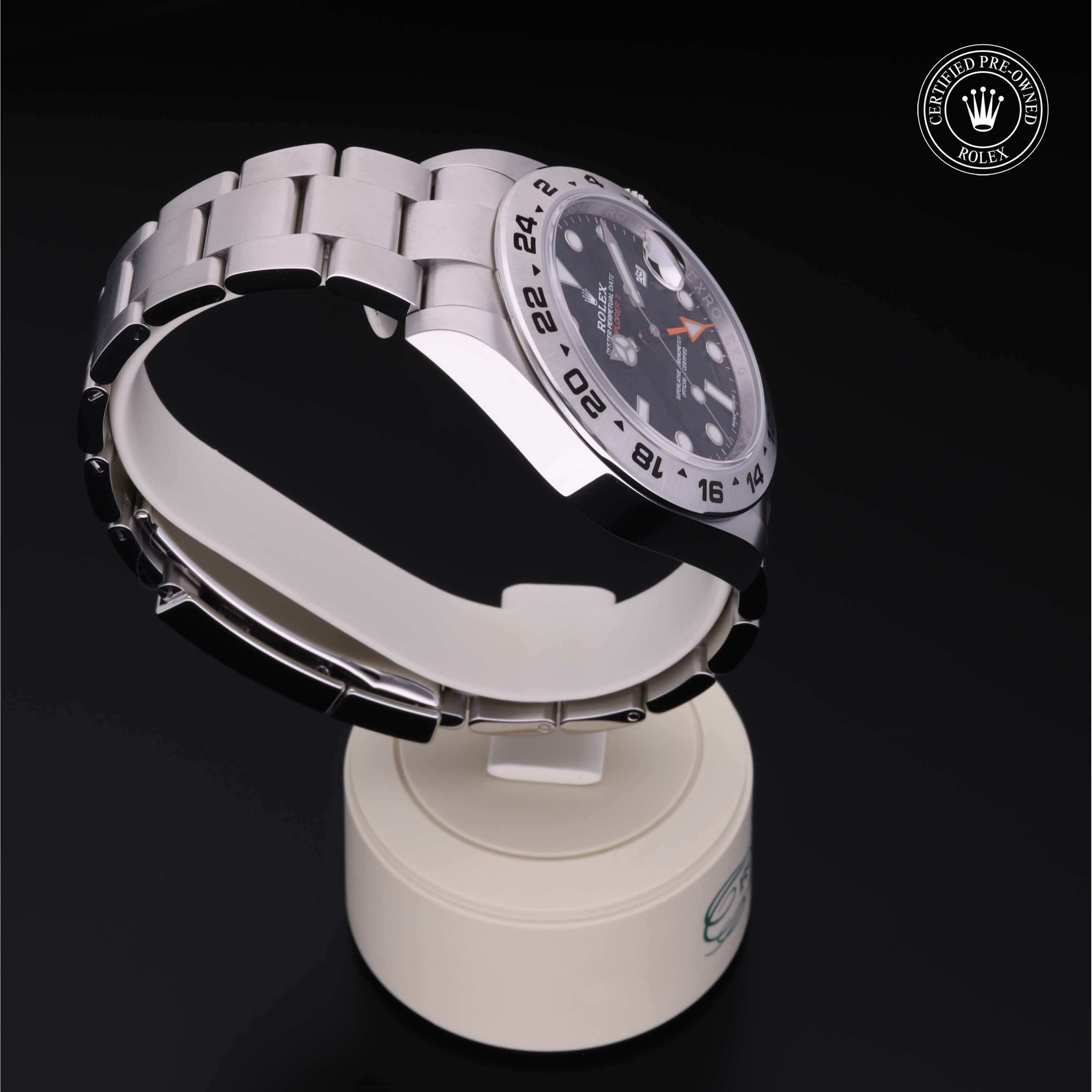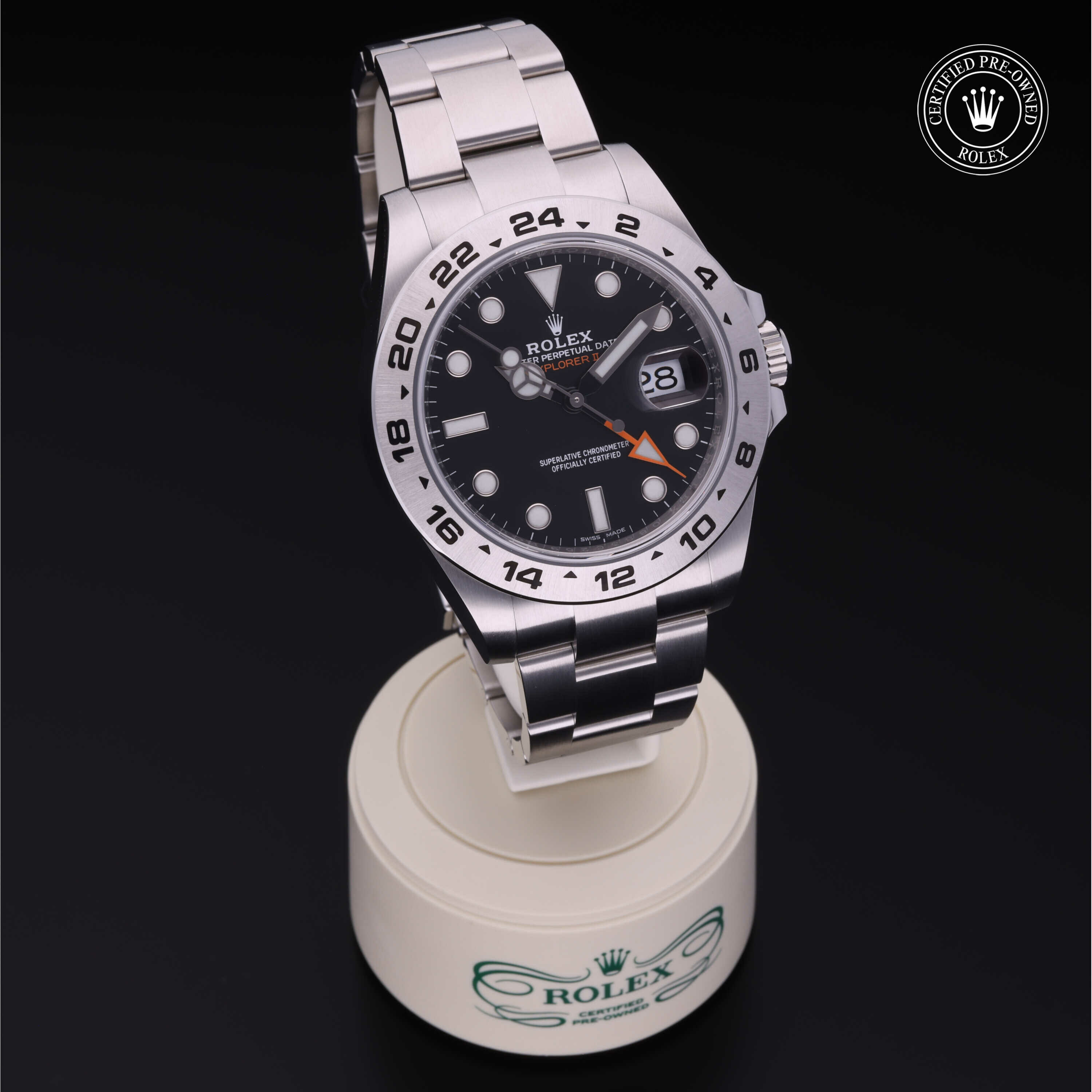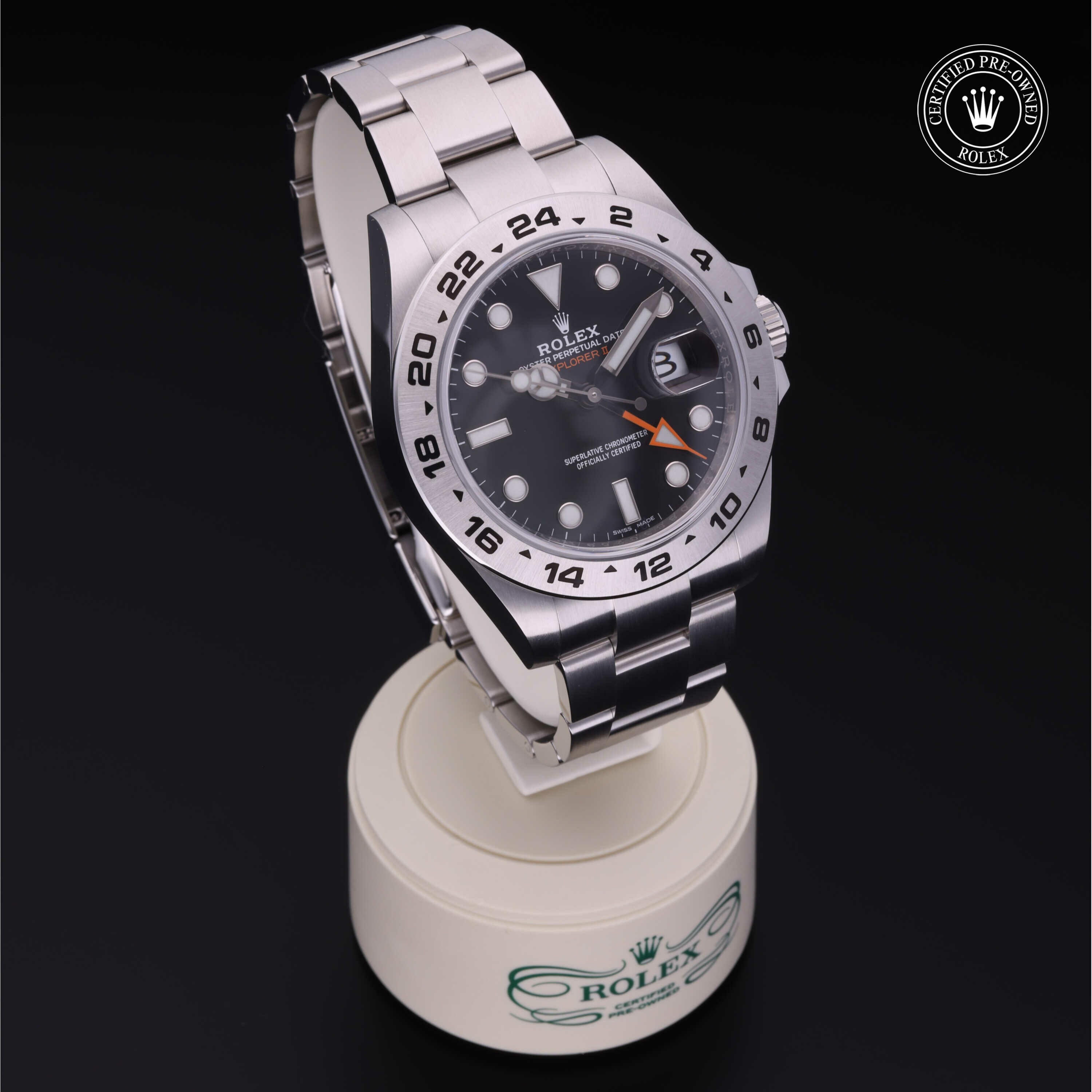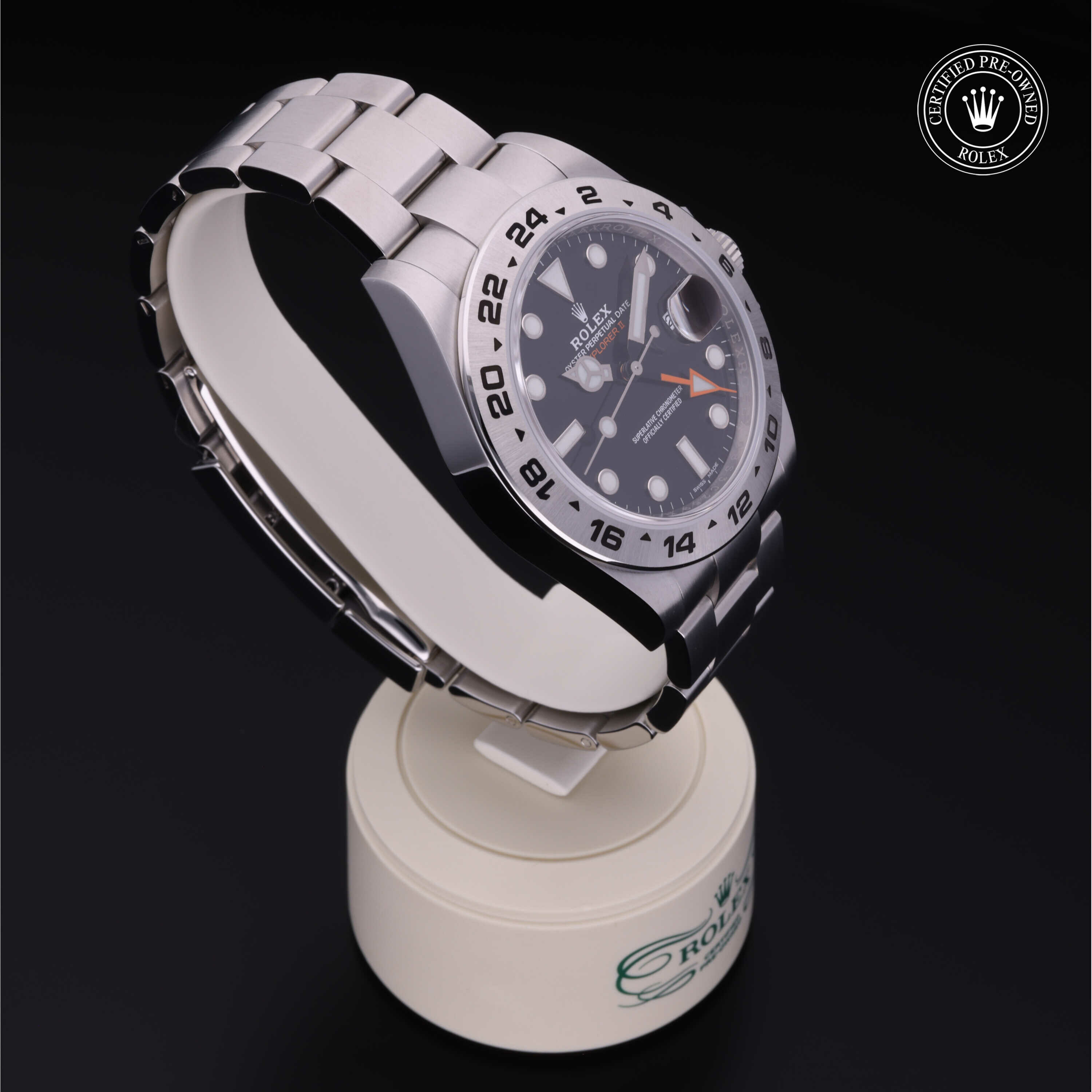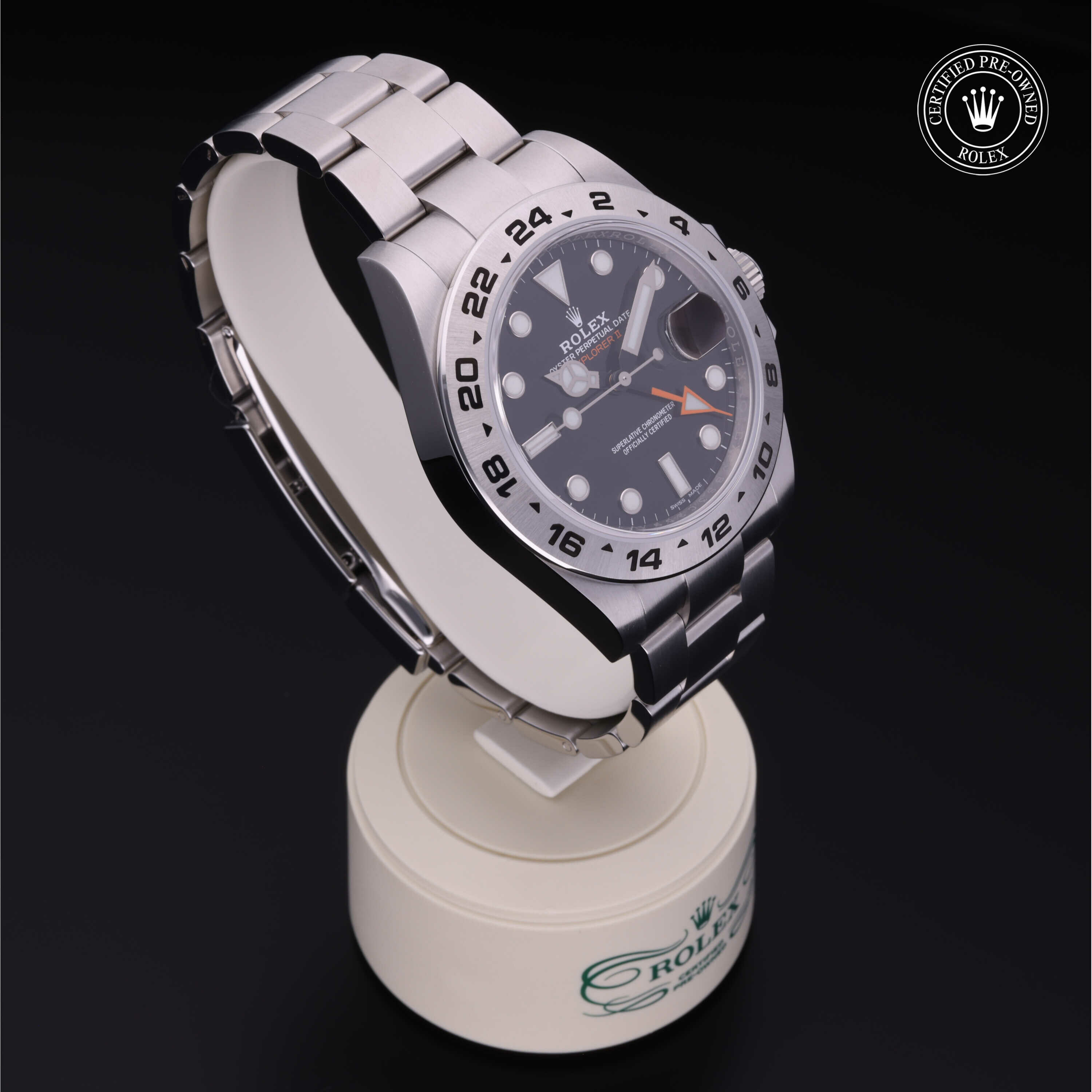 Introduite en 1971, lʼOyster Perpetual Explorer II a été conçue pour les conditions extrêmes et permet au porteur de distinguer les heures du jour de celles de la nuit grâce à son aiguille 24 heures supplémentaire qui indique la graduation 24 heures gravée sur la lunette.