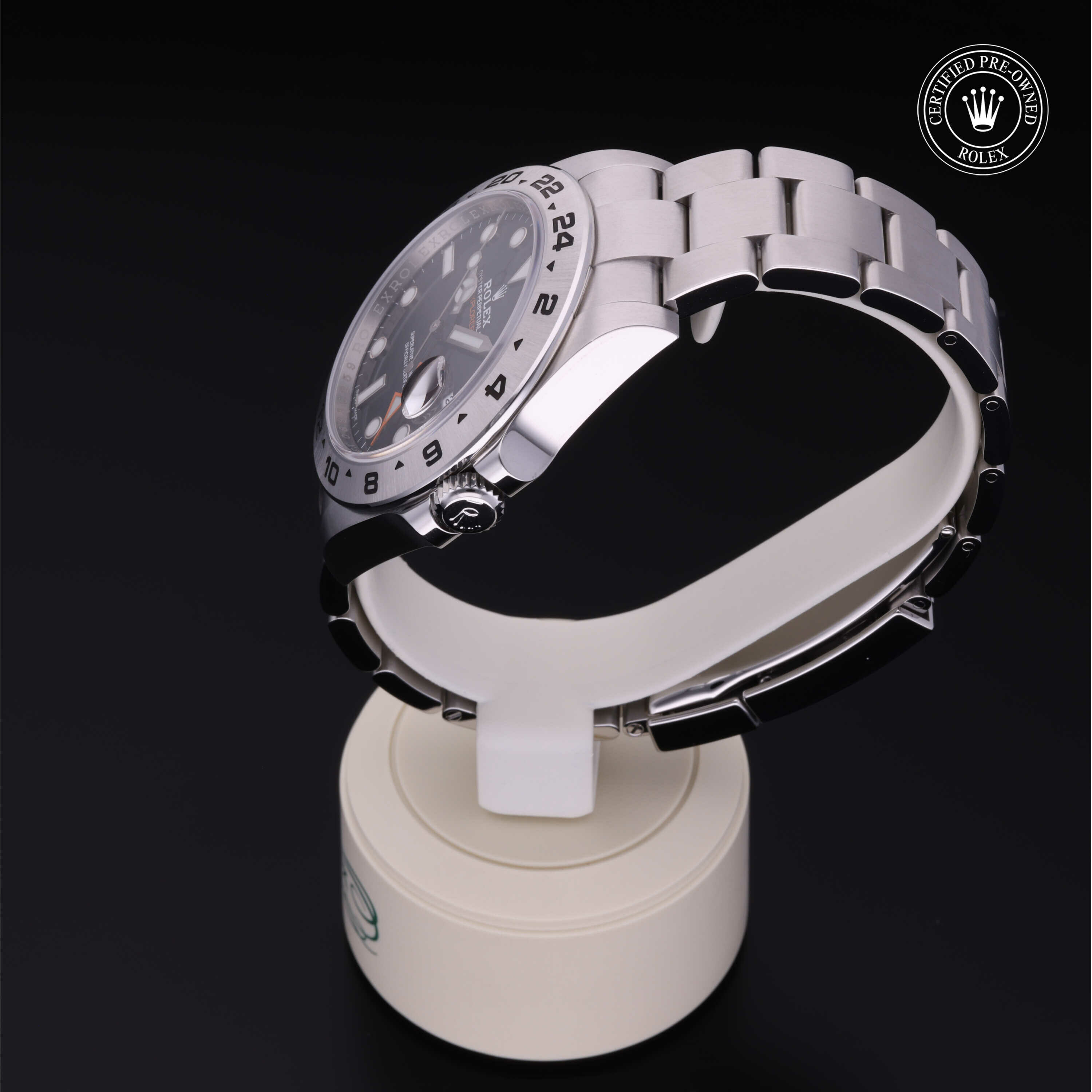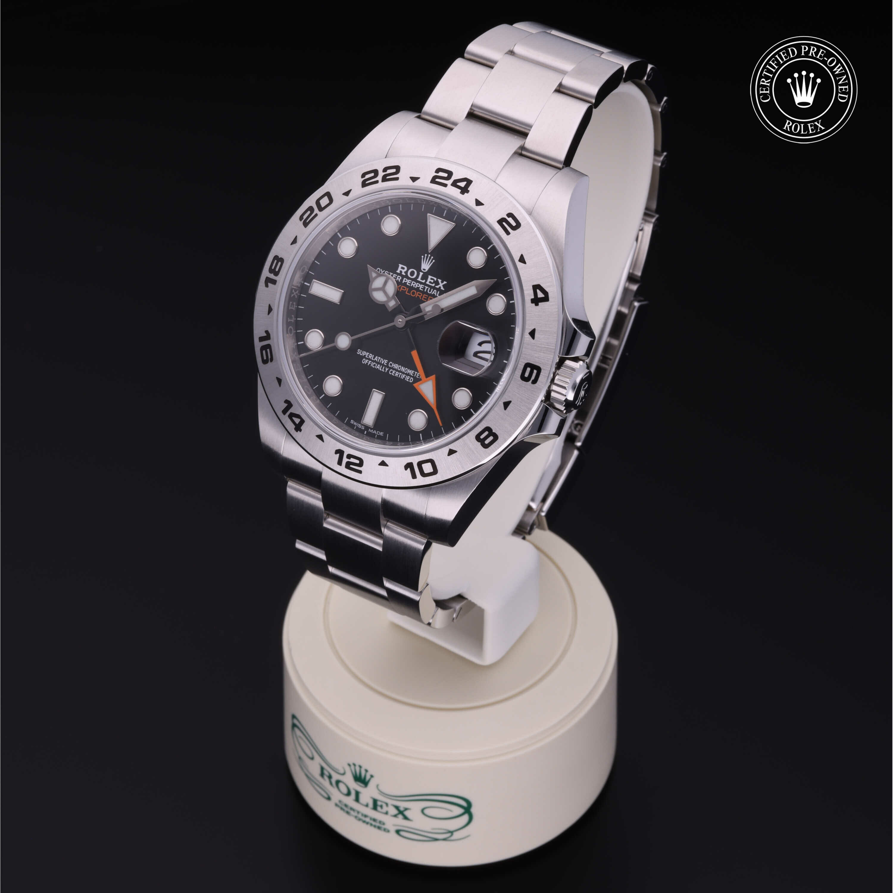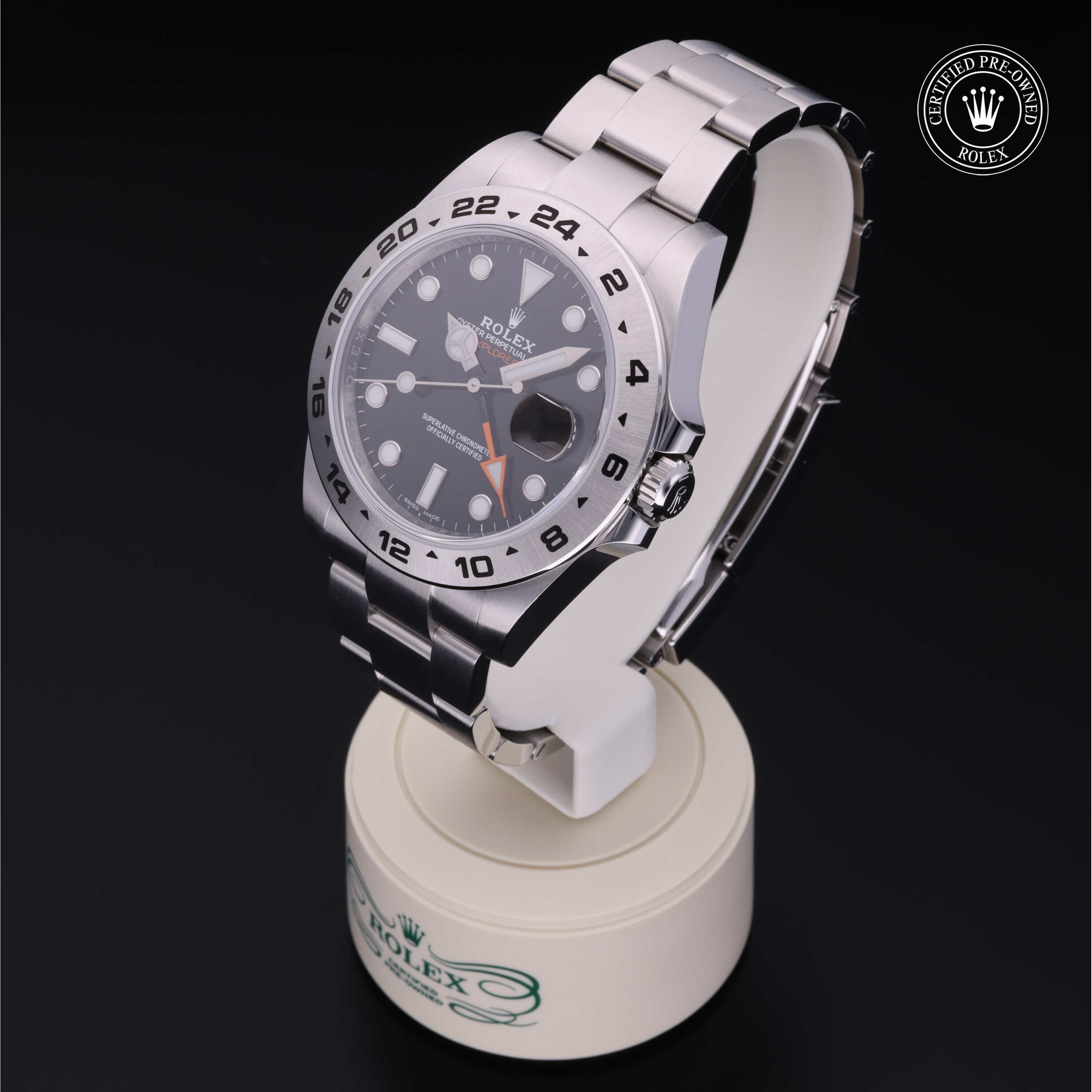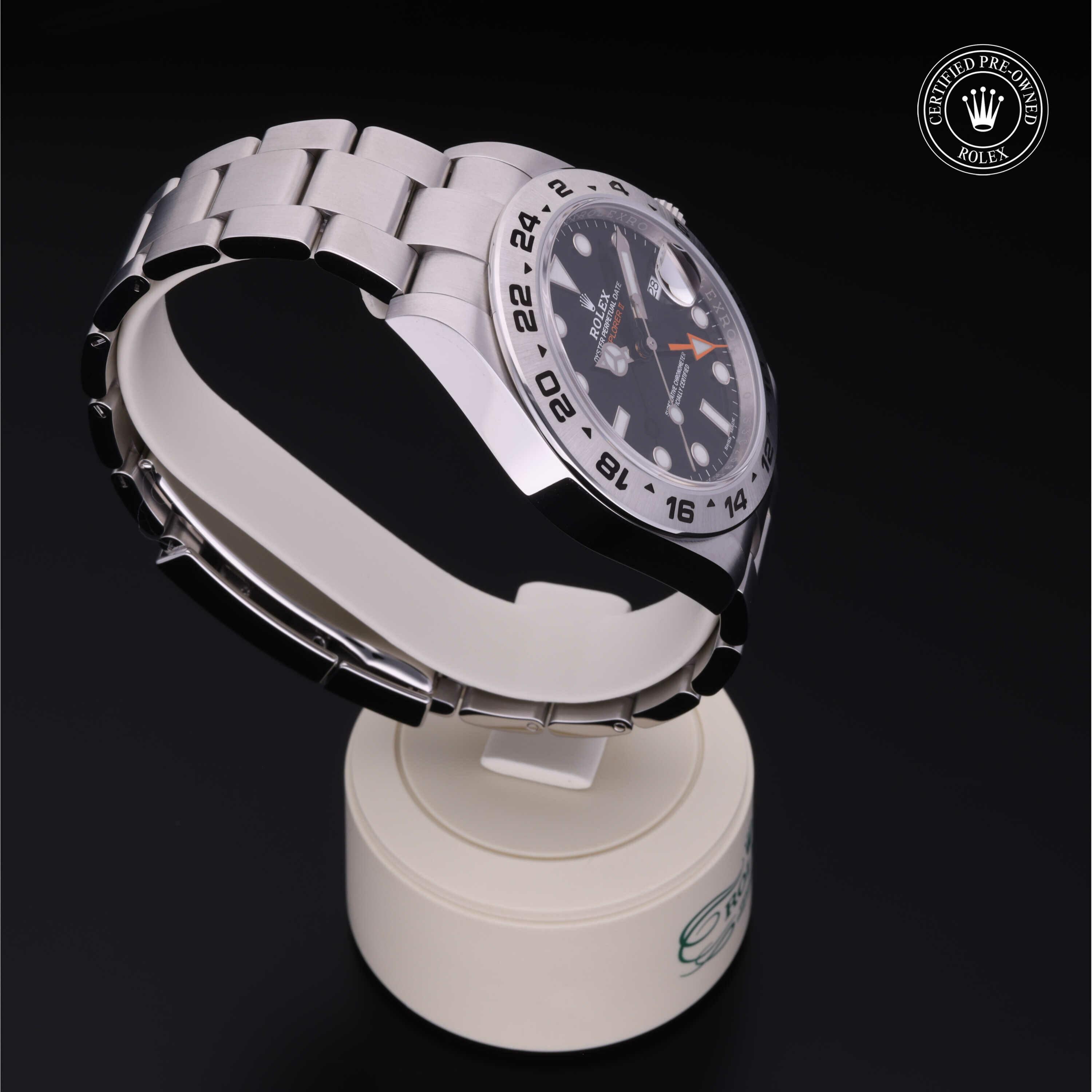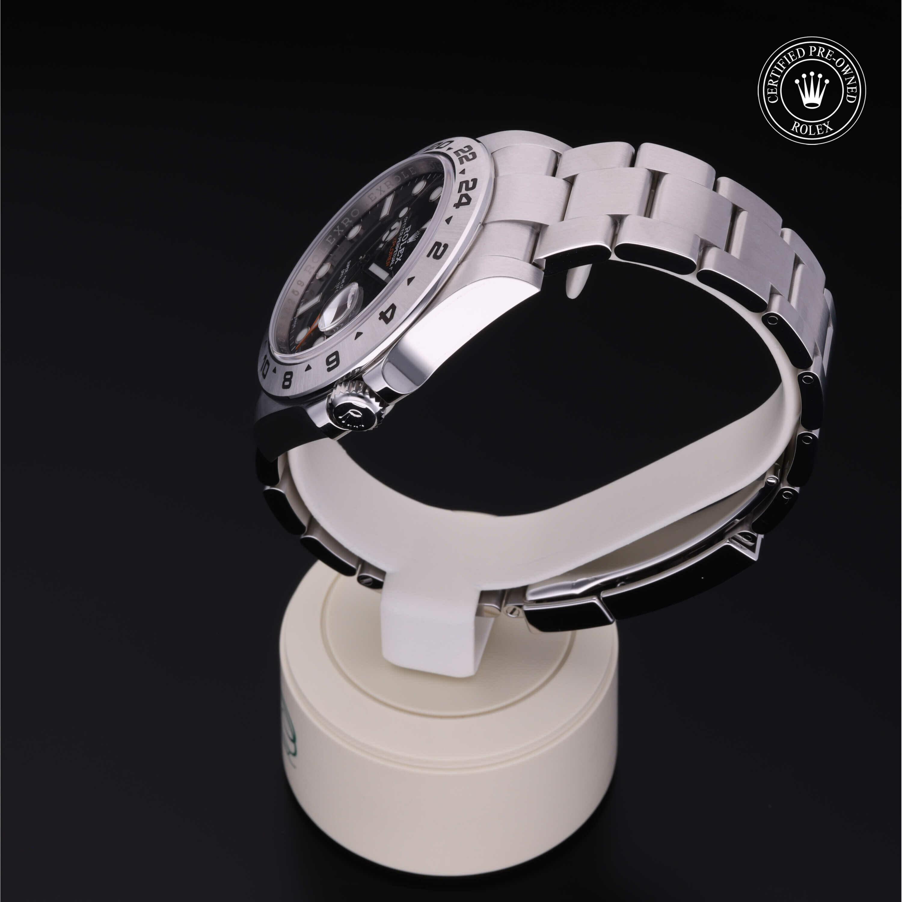 Introduite en 1971, lʼOyster Perpetual Explorer II a été conçue pour les conditions extrêmes et permet au porteur de distinguer les heures du jour de celles de la nuit grâce à son aiguille 24 heures supplémentaire qui indique la graduation 24 heures gravée sur la lunette.