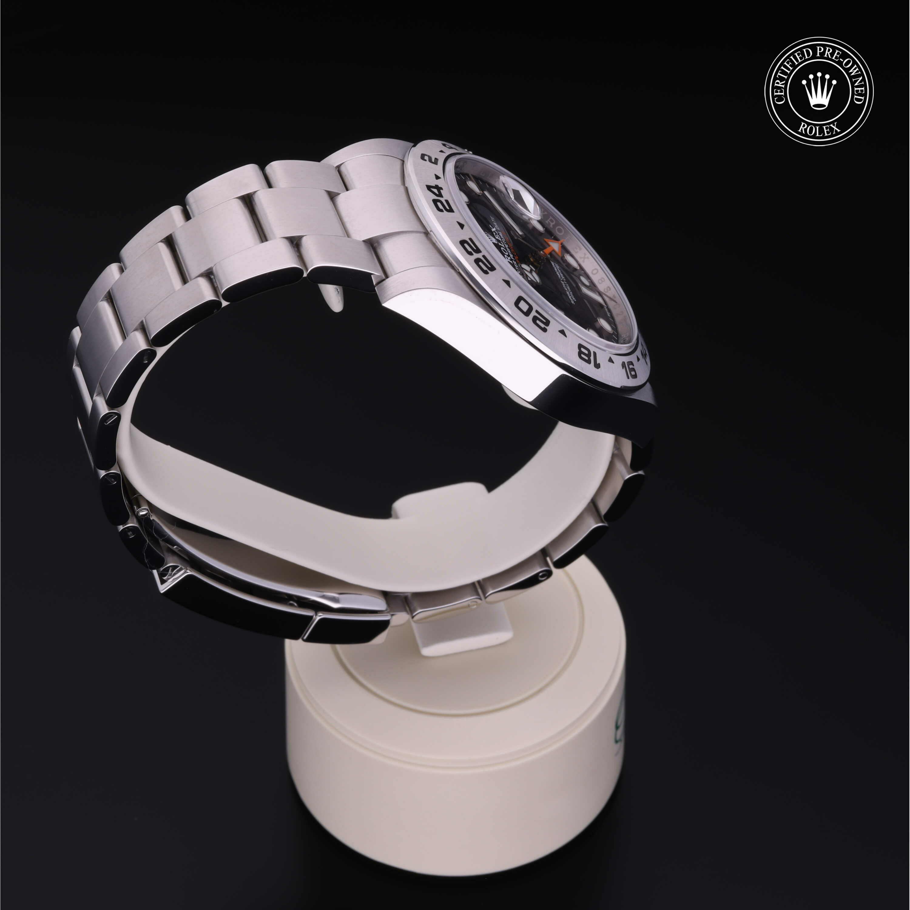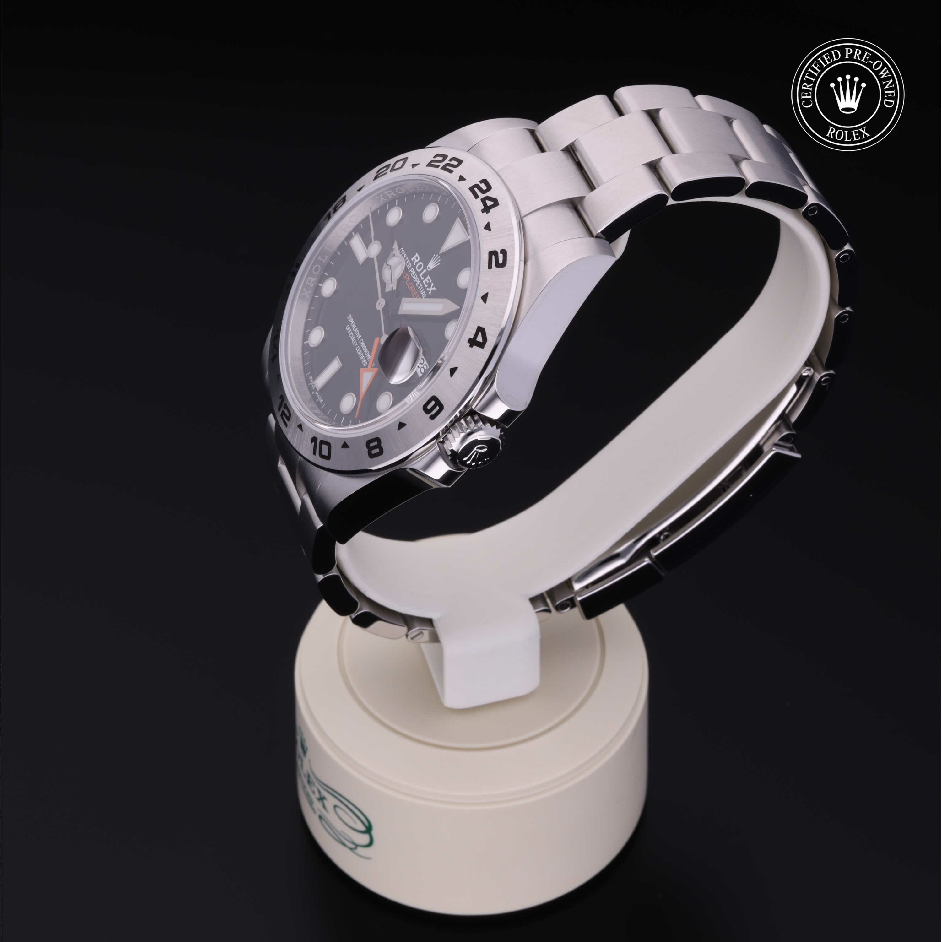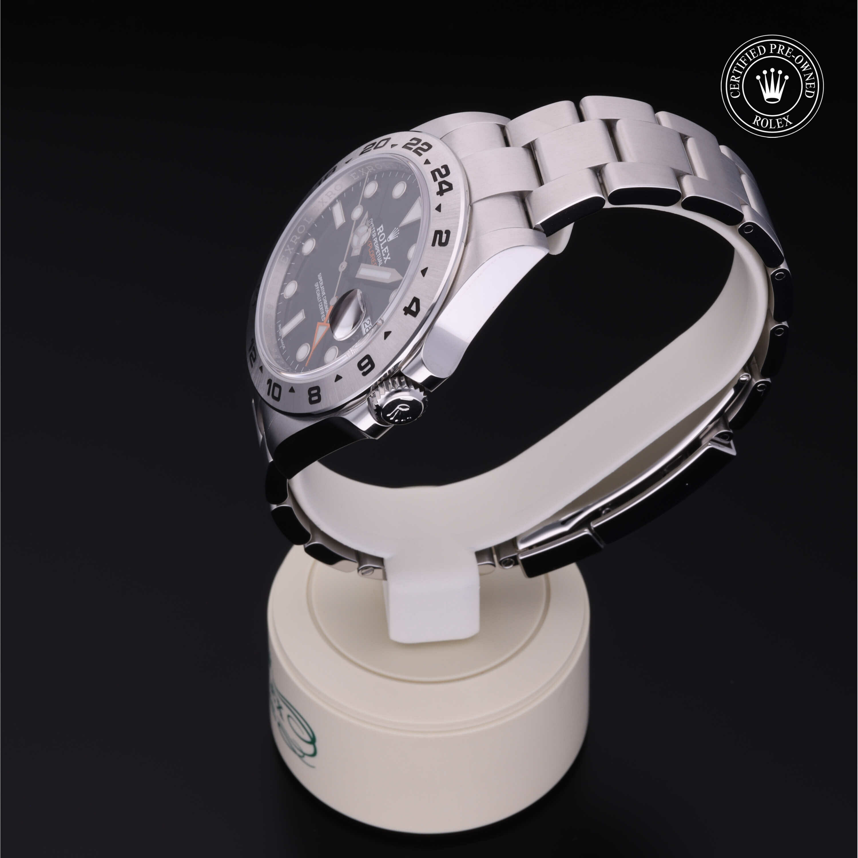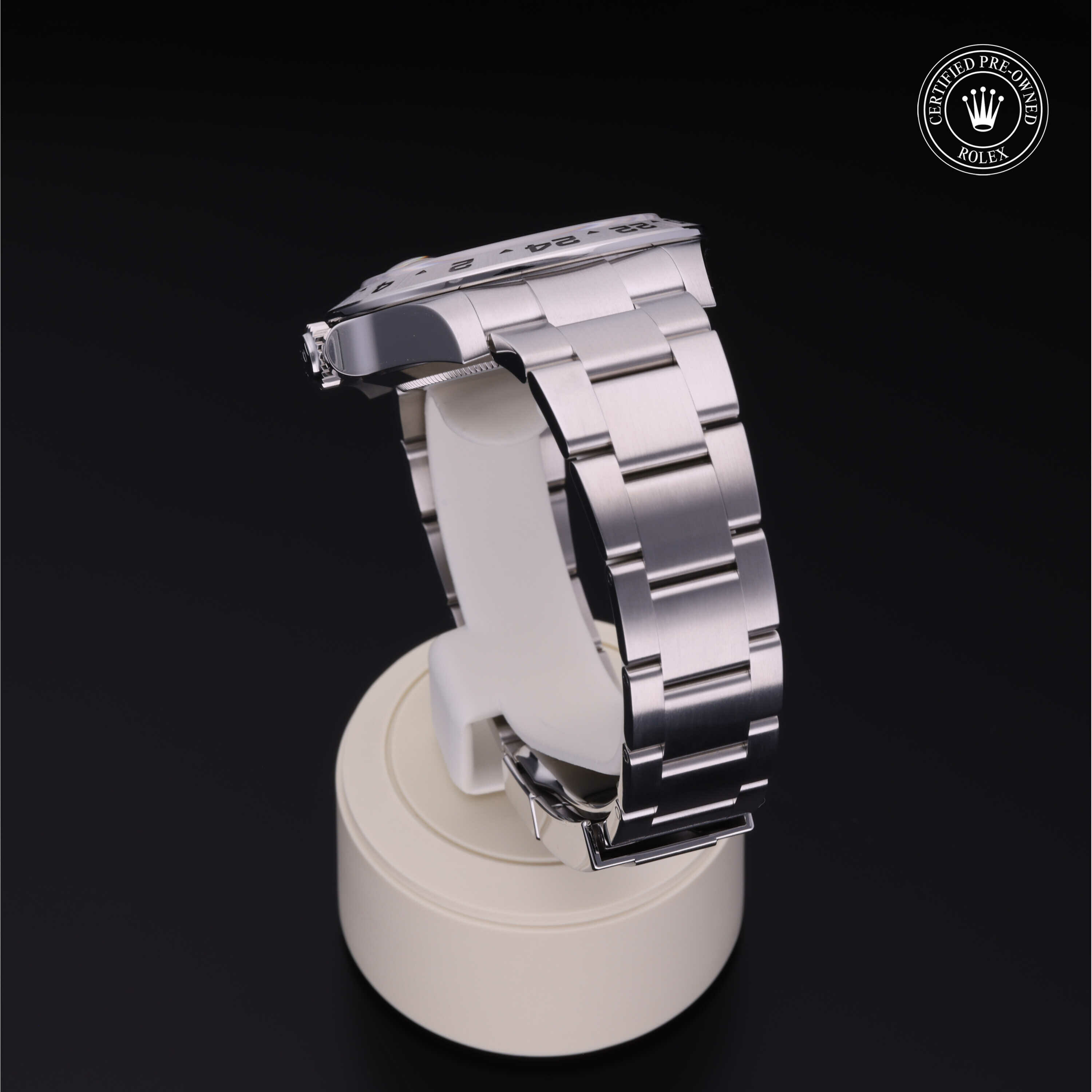 Introduite en 1971, lʼOyster Perpetual Explorer II a été conçue pour les conditions extrêmes et permet au porteur de distinguer les heures du jour de celles de la nuit grâce à son aiguille 24 heures supplémentaire qui indique la graduation 24 heures gravée sur la lunette.