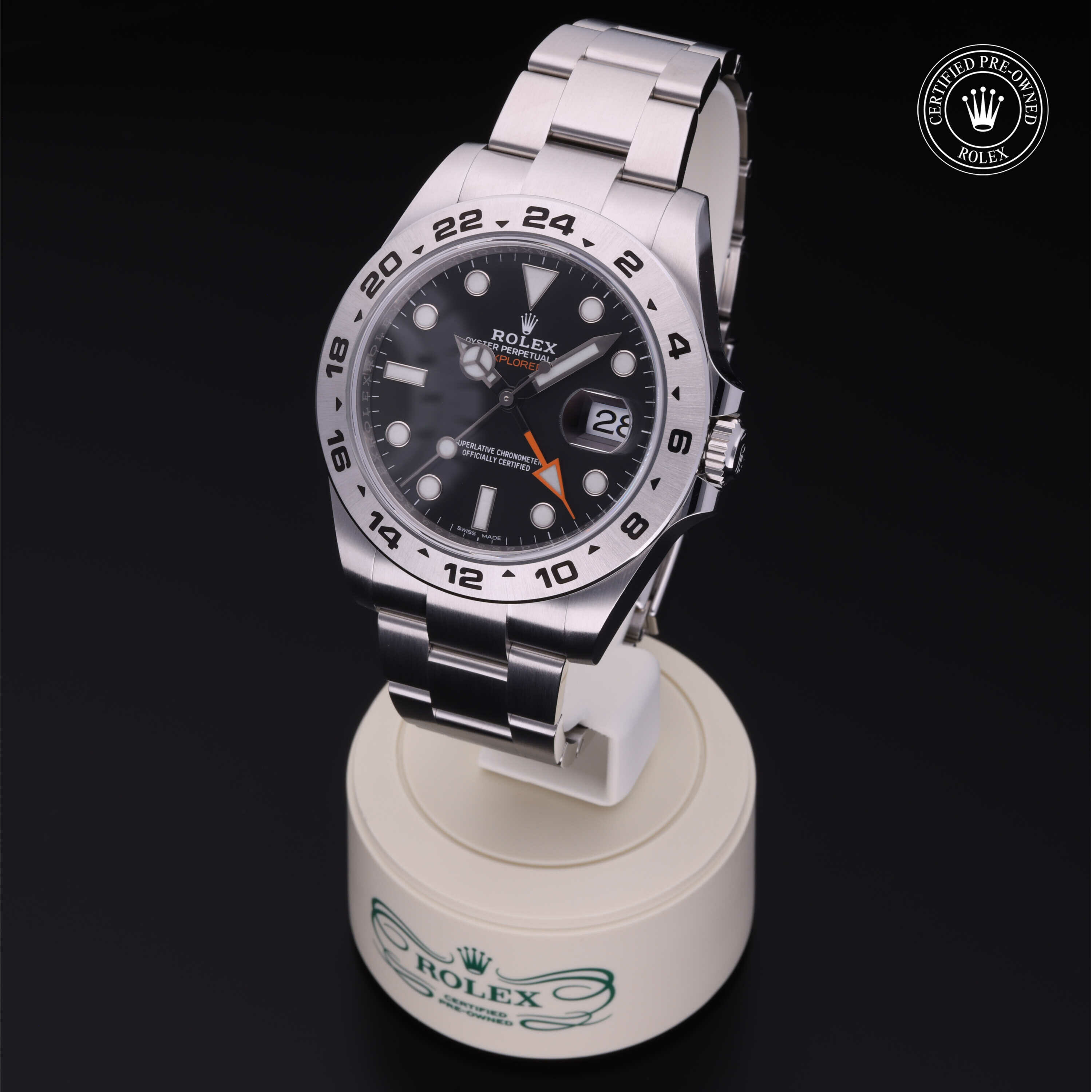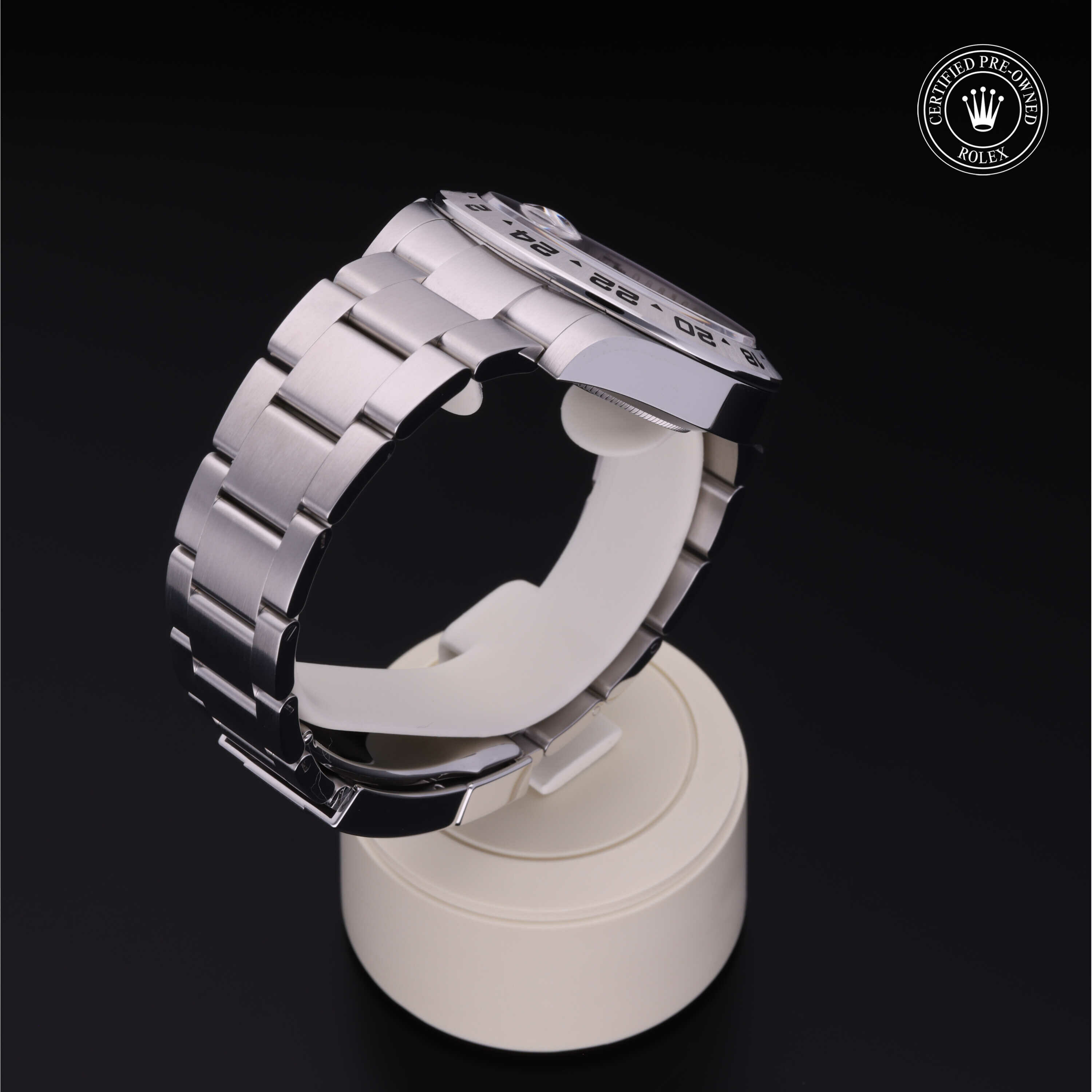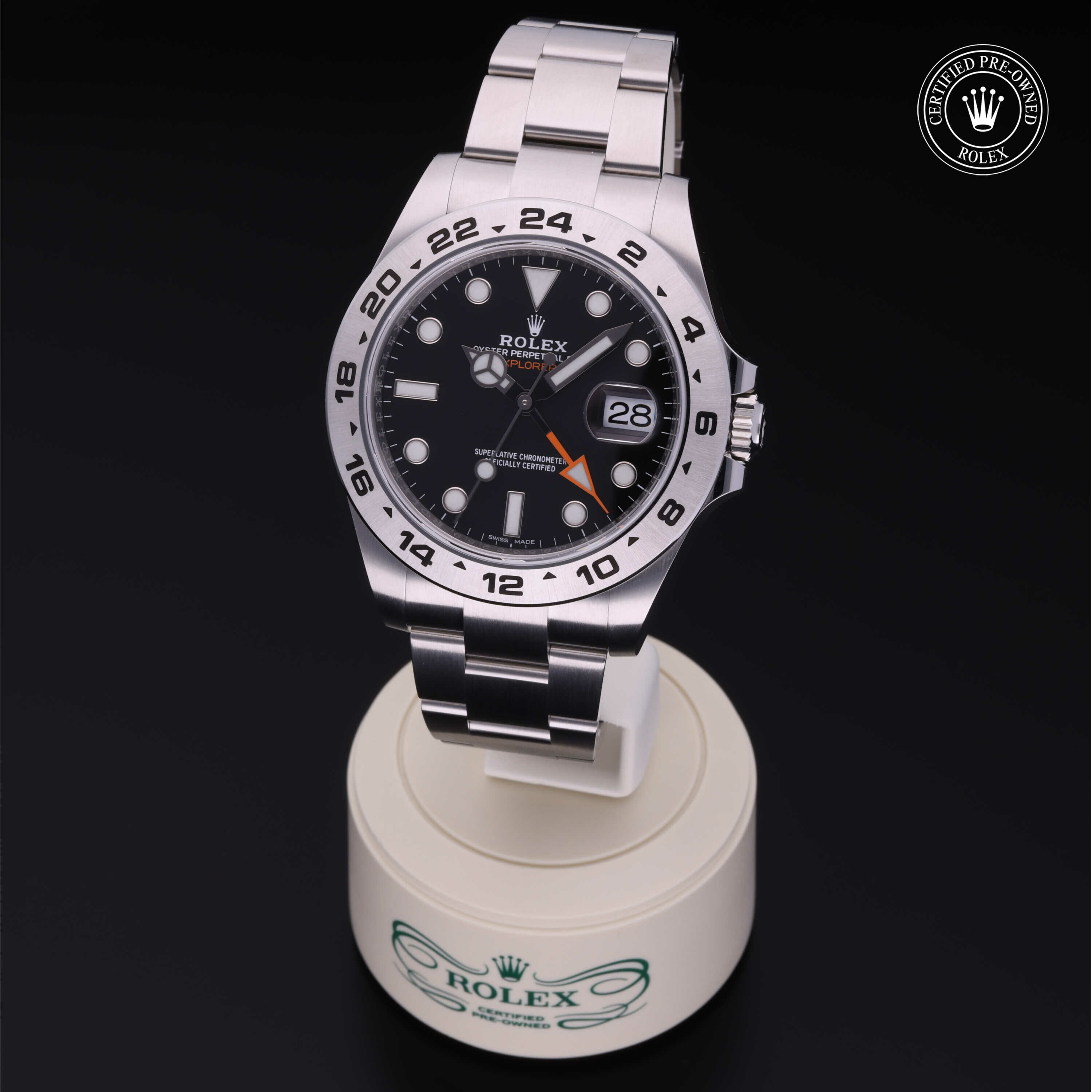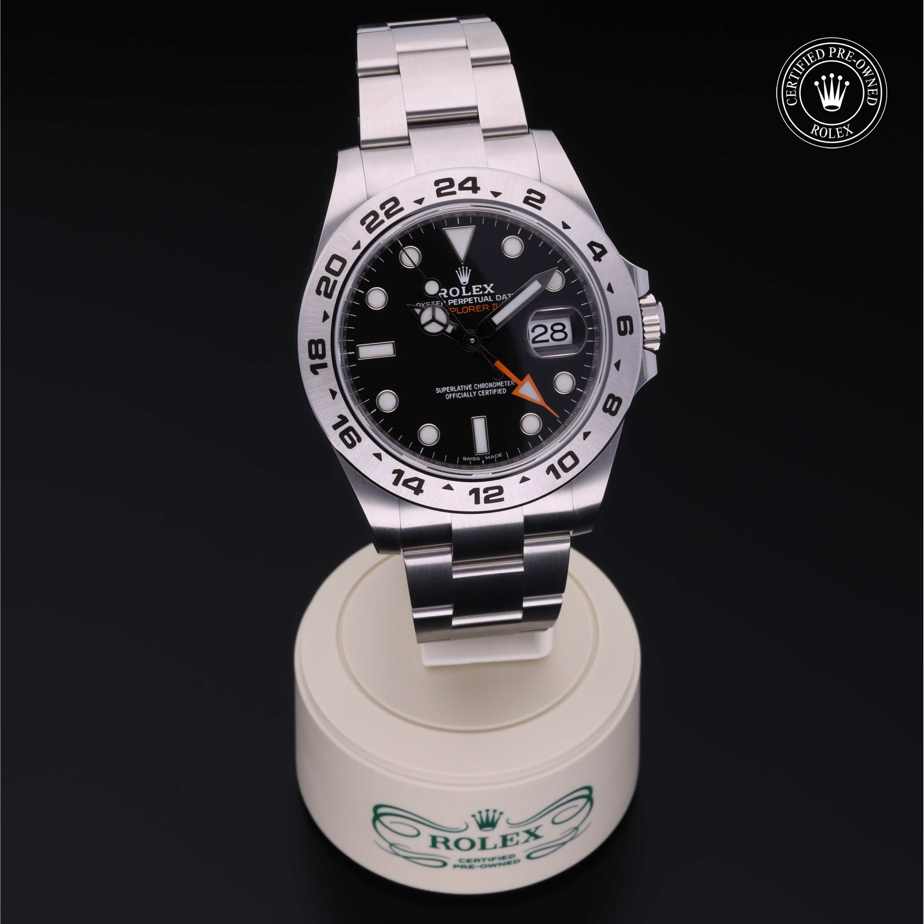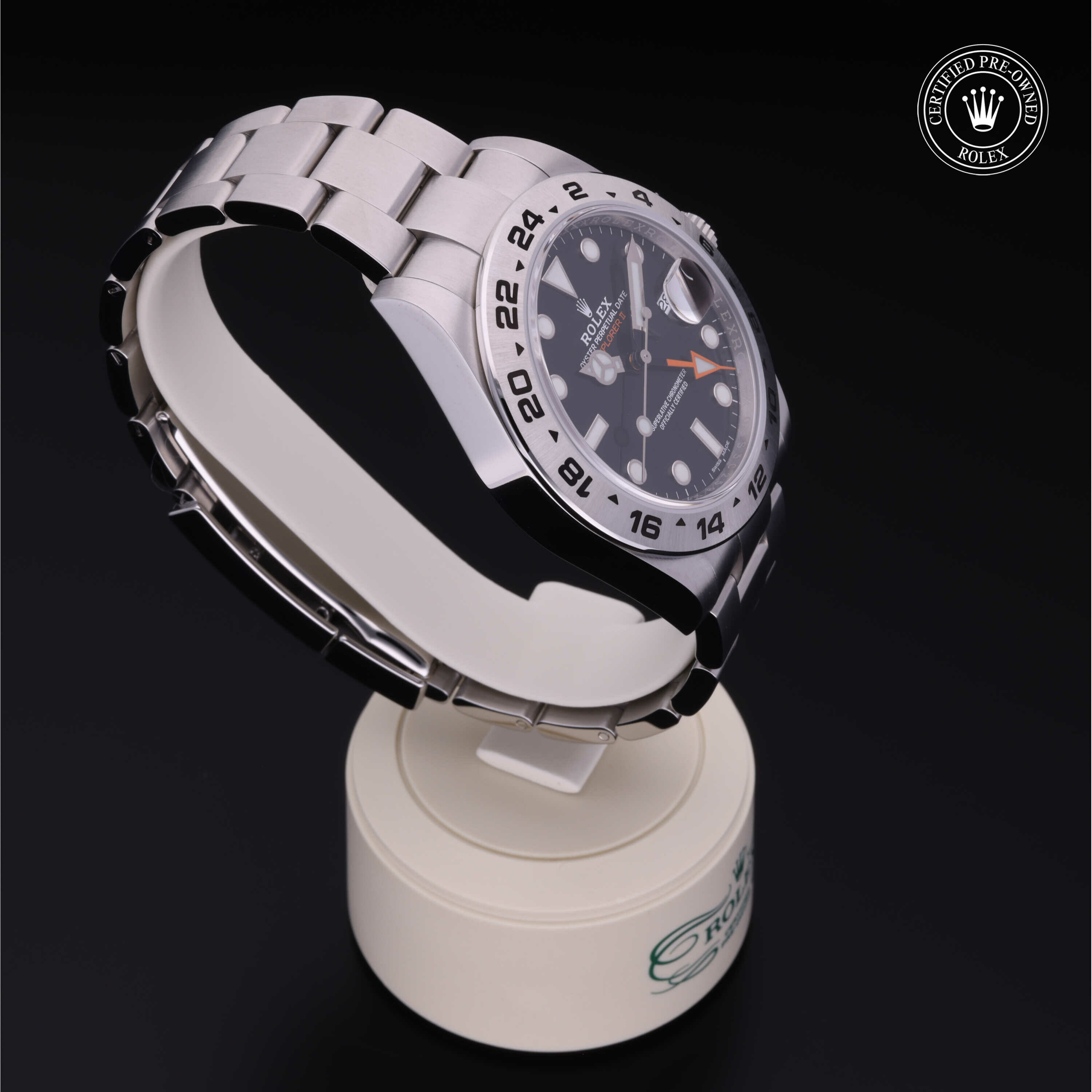 Introduite en 1971, lʼOyster Perpetual Explorer II a été conçue pour les conditions extrêmes et permet au porteur de distinguer les heures du jour de celles de la nuit grâce à son aiguille 24 heures supplémentaire qui indique la graduation 24 heures gravée sur la lunette.