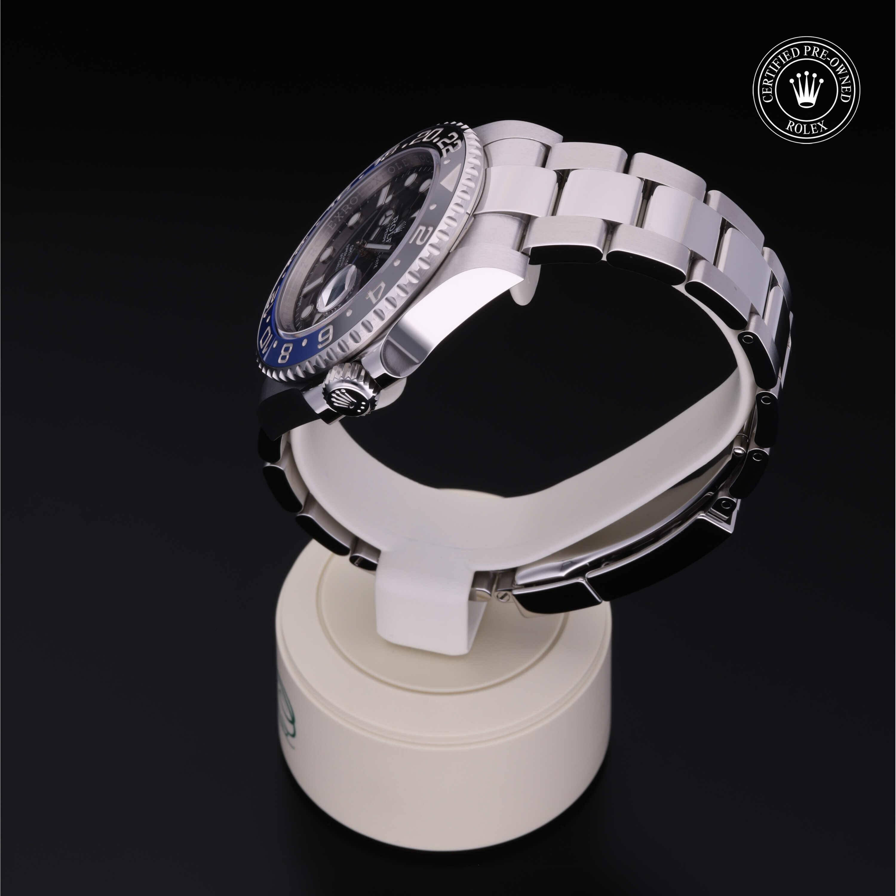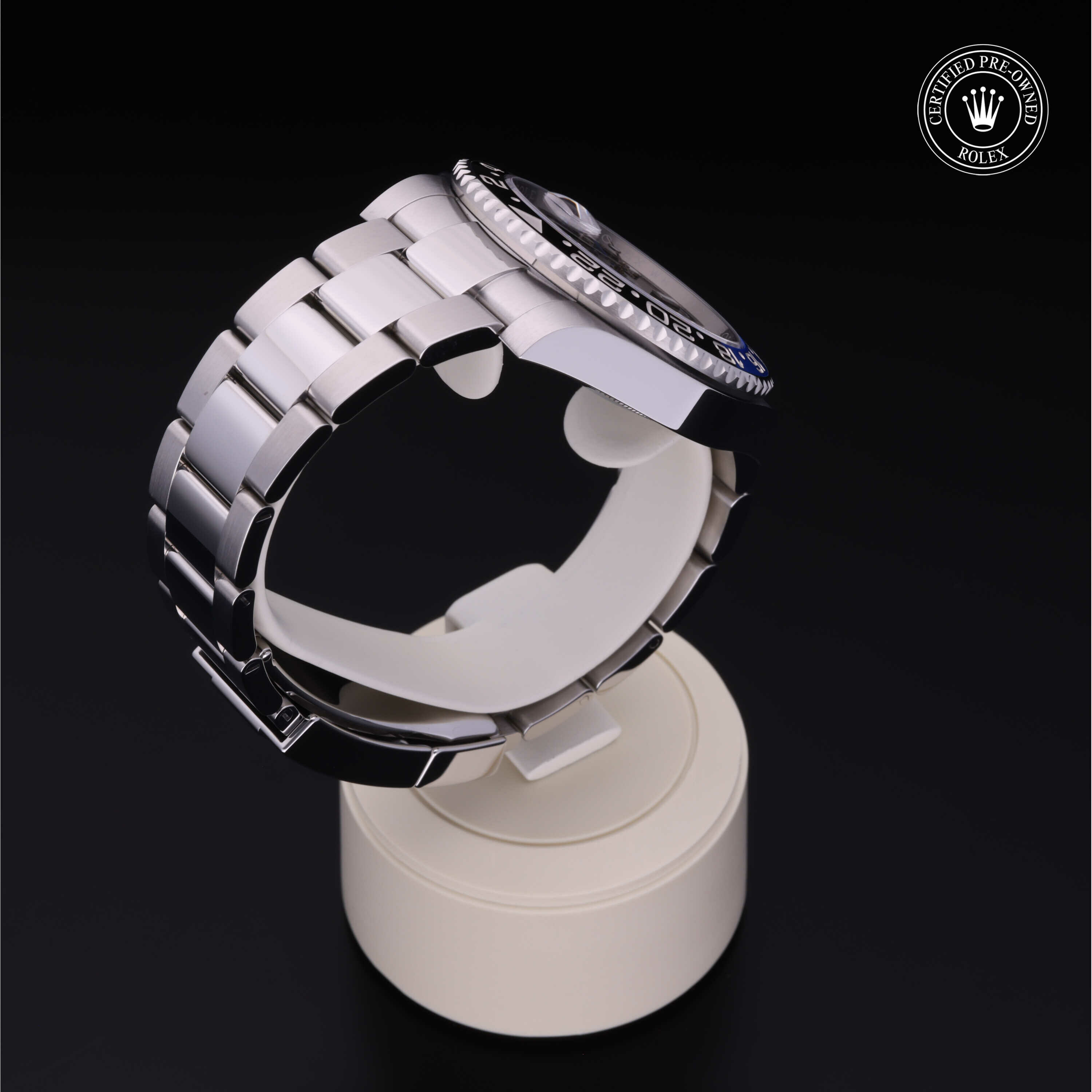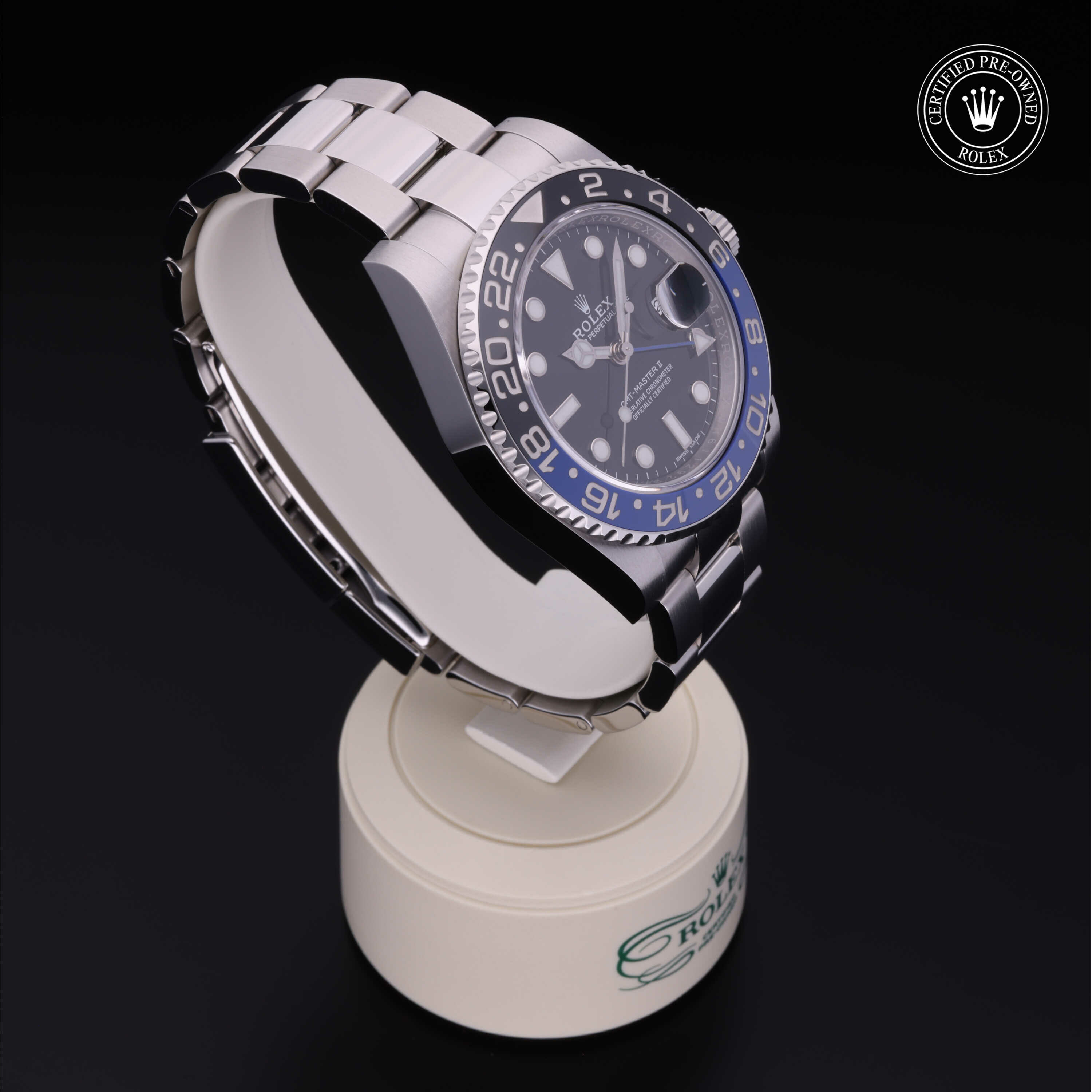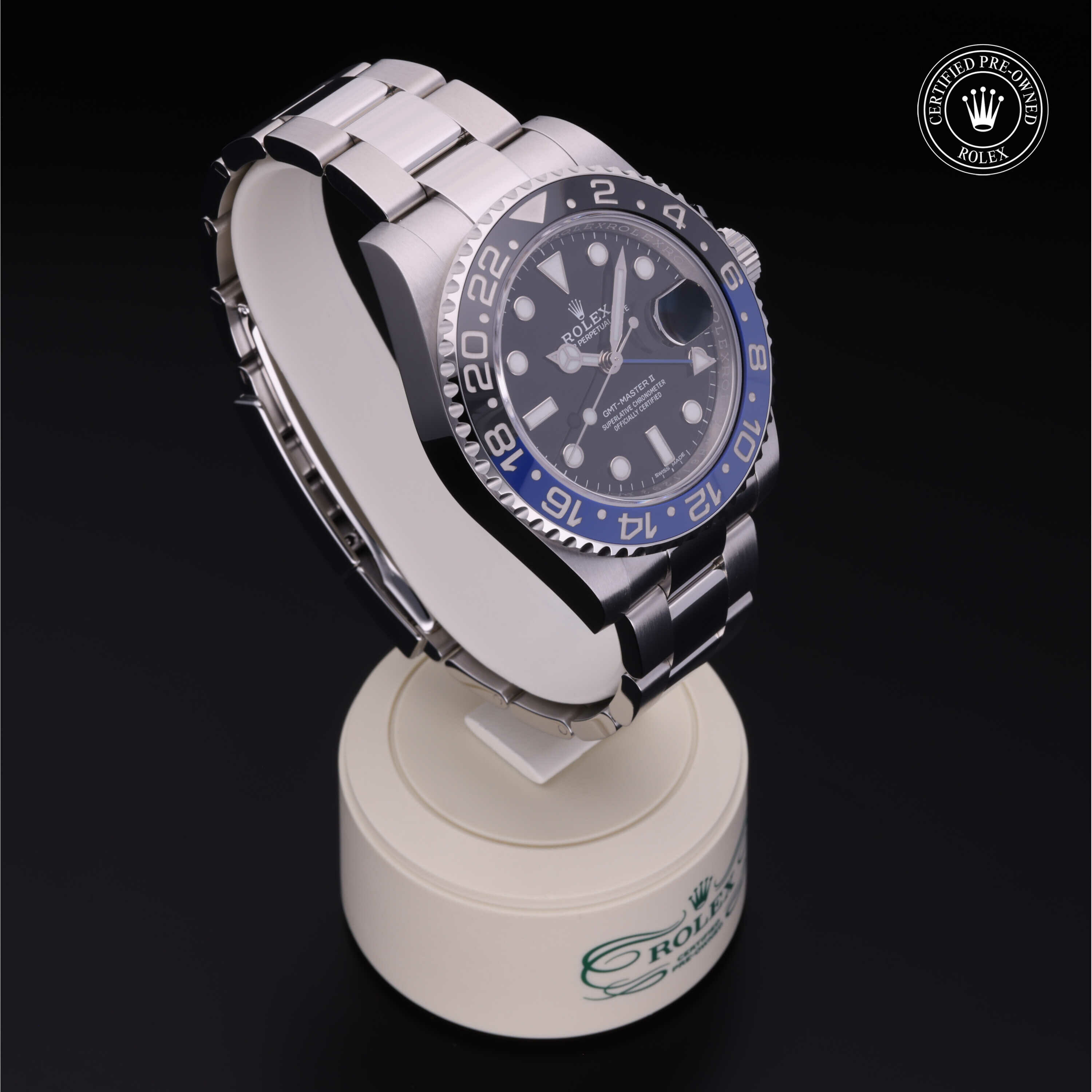 Présentée en 1982, lʼOyster Perpetual GMT‑Master II est dotée de l’emblématique disque de lunette bicolore – aujourd’hui façonné en céramique de haute technologie – et permet la lecture simultanée de l’heure de deux fuseaux horaires. Elle est l’héritière directe de la GMT‑Master d’origine lancée en 1955, qui a été rapidement adoptée par les pilotes transatlantiques comme un instrument d’aide à la navigation.