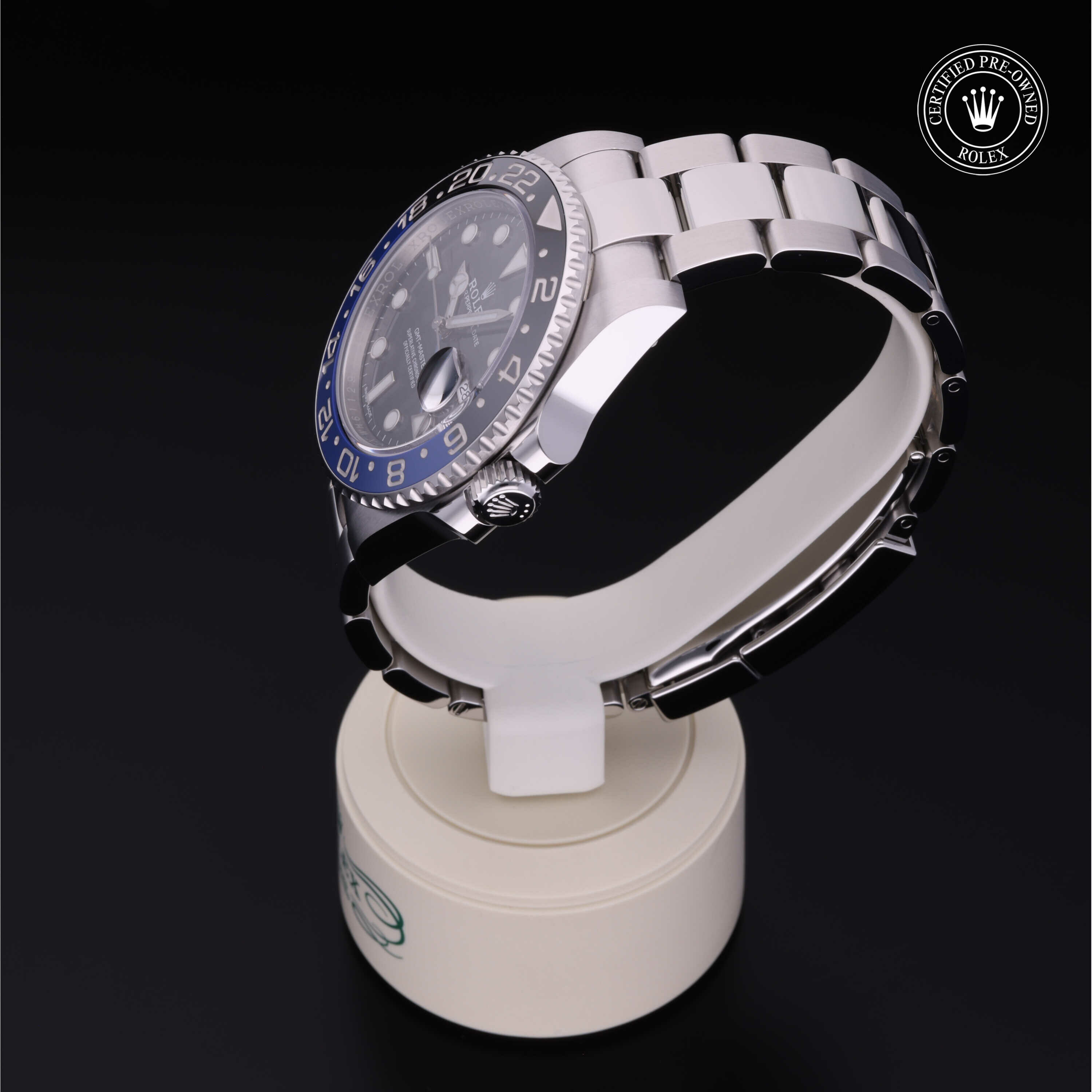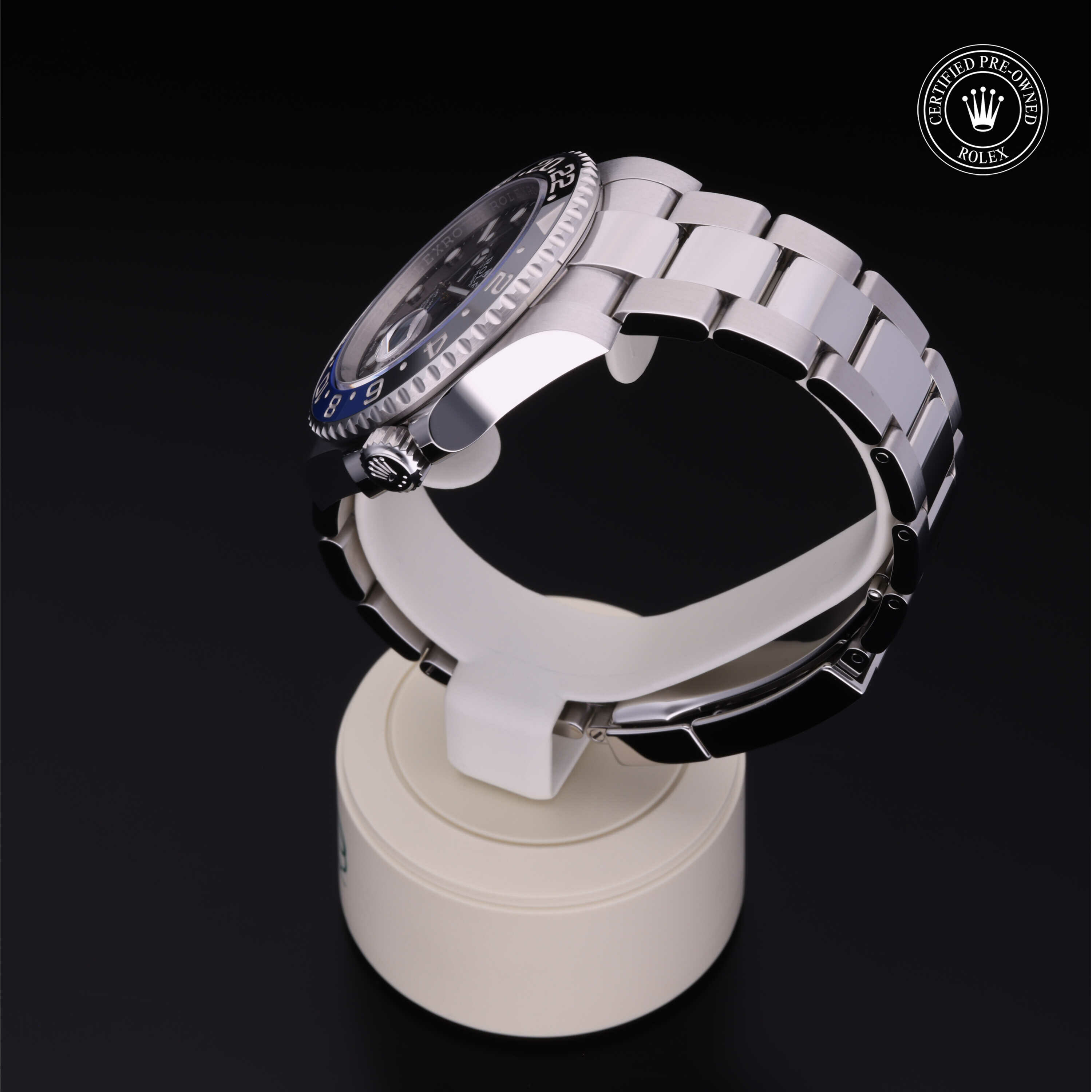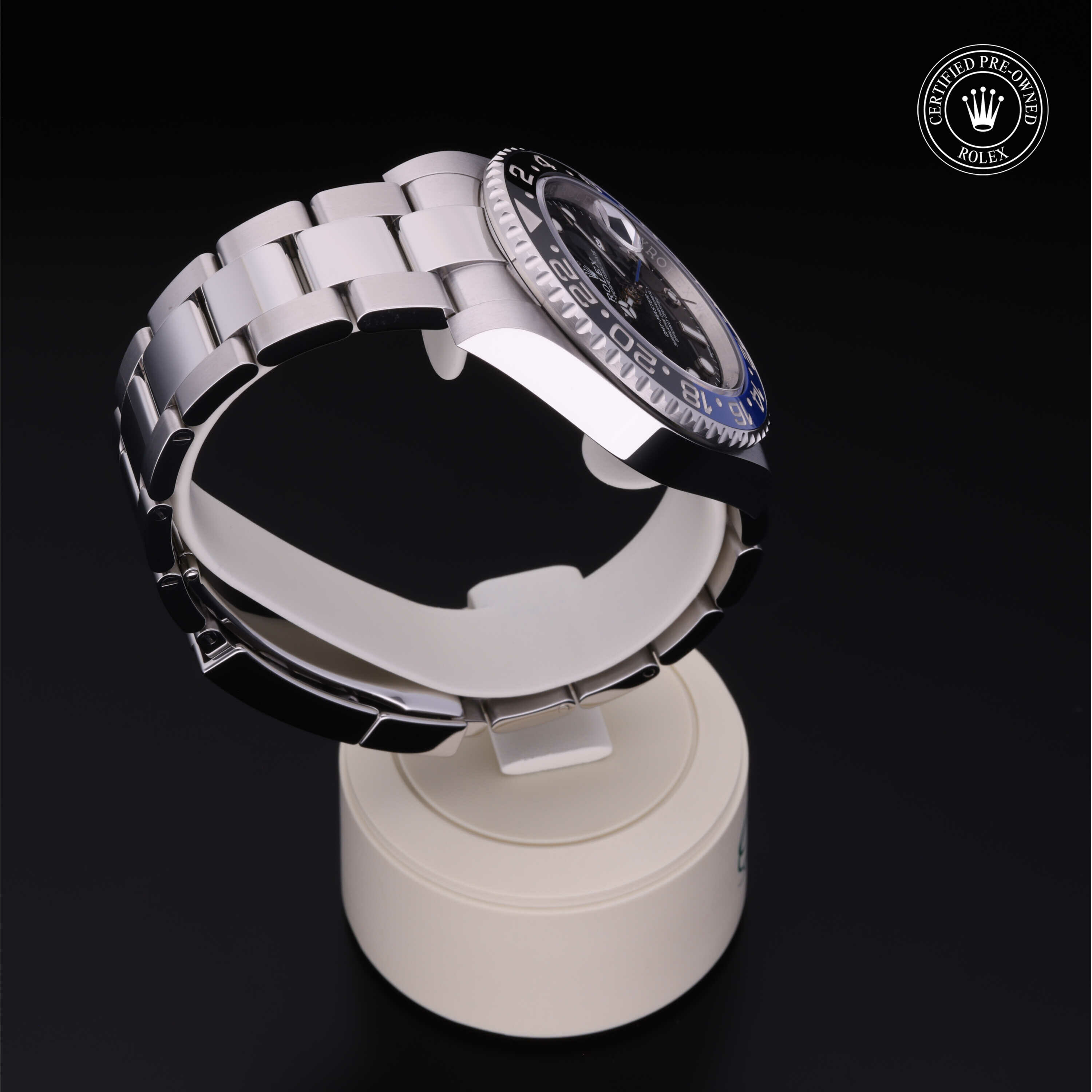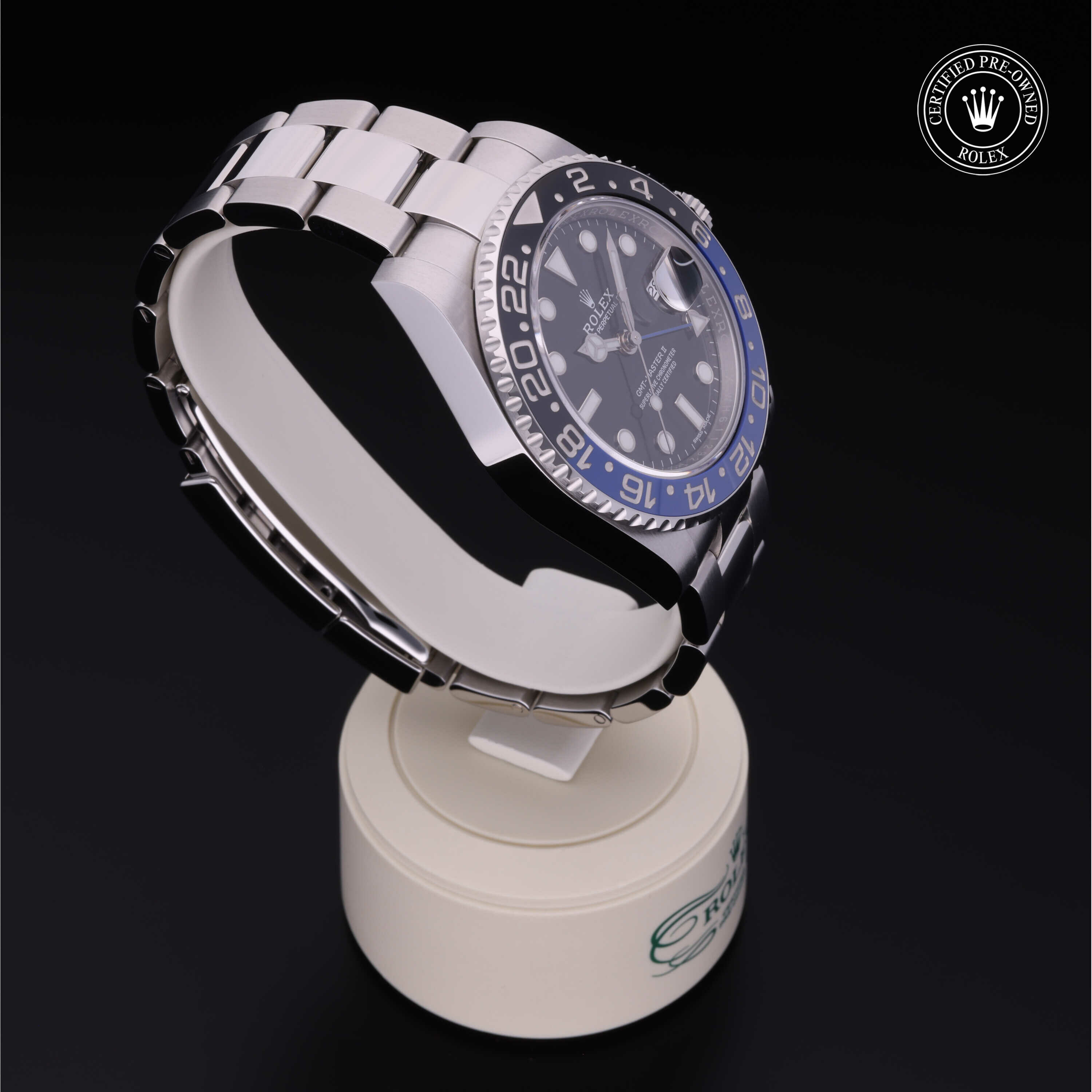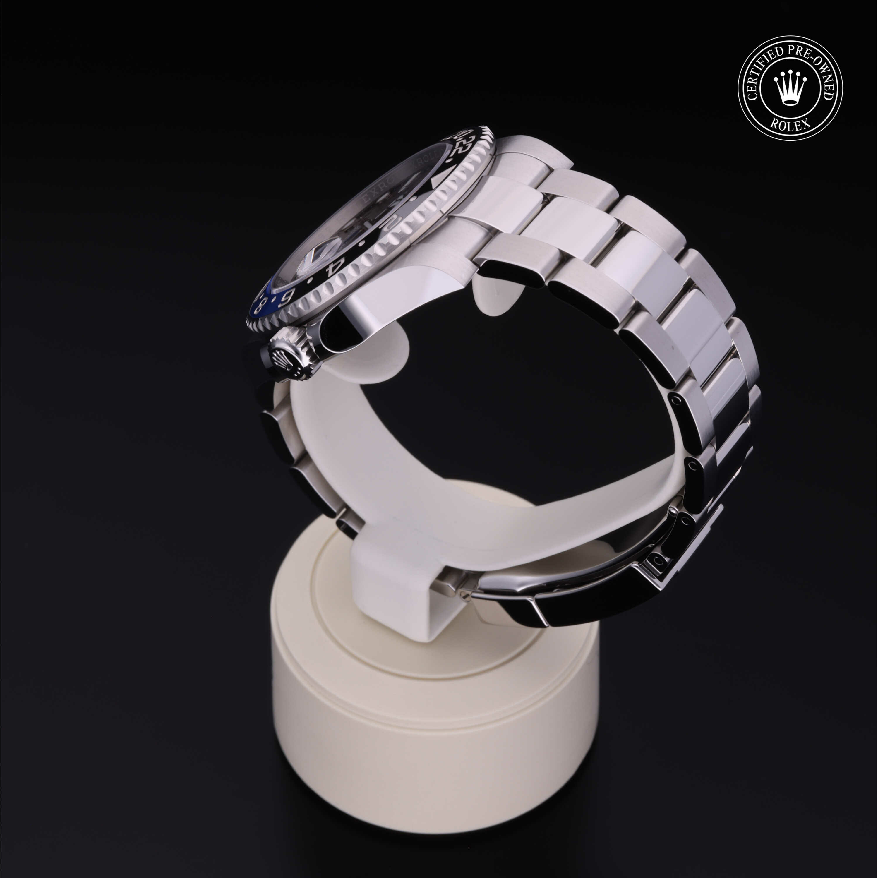 Présentée en 1982, lʼOyster Perpetual GMT‑Master II est dotée de l’emblématique disque de lunette bicolore – aujourd’hui façonné en céramique de haute technologie – et permet la lecture simultanée de l’heure de deux fuseaux horaires. Elle est l’héritière directe de la GMT‑Master d’origine lancée en 1955, qui a été rapidement adoptée par les pilotes transatlantiques comme un instrument d’aide à la navigation.